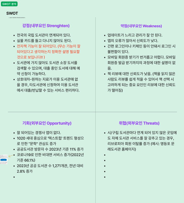 우리 조에서 분석한 '리브로피아'의 SWOT 분석이다.